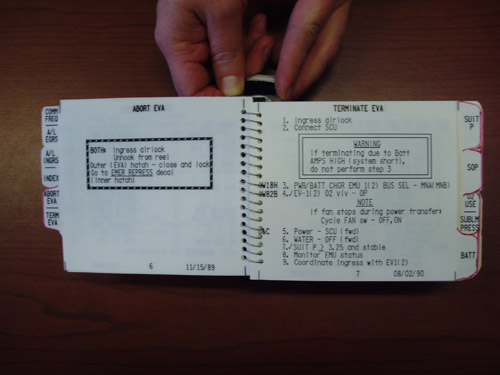 The following images show some sample pages from the STS-75 EVA guide worn on the arm of the astronaut, as well as material layer samples from a space suit.