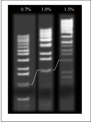 DNA fragments resolved with three agarose concentrations. The line indicates the 1000 base pair fragment. (Figure by MIT OpenCourseWare.)