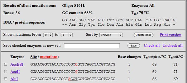 - On your results page, cross off any choices that do not occur on either of the restriction site lists. For any choice that is on one of the lists, write a "2" or "1" or "0" next to it, depending on how many times it is present in the plasmid. This should leave very few choices indeed! For example, for the S101L primer, only two choices is left: BsgI and FspI, both double-cutters.