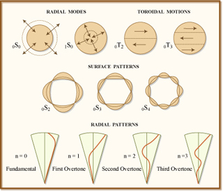 Surface and nodal patterns of free oscillations. (Image by MIT OpenCourseWare.)
