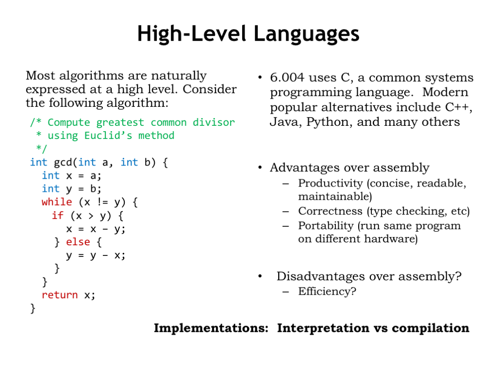 Here we see Euclid’s algorithm for determining the greatest common divisor of two numbers, in this case the algorithm is written in the C programming language. We’ll be using a simple subset of C as our example high-level language. Please see the brief overview of C in the Handouts section if you’d like an introduction to C syntax and semantics. C was developed by Dennis Ritchie at AT&T Bell Labs in the late 60’s and early 70’s to use when implementing the Unix operating system. Since that time many new high-level languages have been introduced providing modern abstractions like object-oriented programming along with useful new data and control structures.