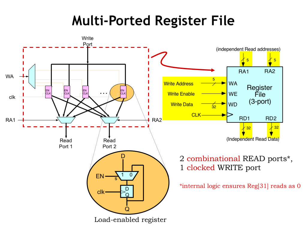 For convenience, we’ll package all this functionality up into a single component called a “register file”. The register file has two read ports, which given a 5-bit address input, deliver the selected register value on the read-data ports. The two read ports operate independently. They can read from different registers or, if the addresses are the same, read from the same register.