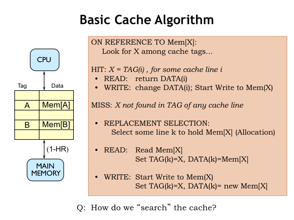 Of course, we’ll need to figure how to quickly search the cache, i.e., we’ll a need fast way to answer the question of whether a particular address tag can be found in some cache line. That’s our next topic.