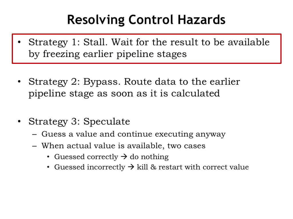 The third strategy is called speculation. We’ll make an intelligent guess for the needed value and continue execution. Once the actual value is determined, if we guessed correctly, we’re all set. If we guessed incorrectly, we have to back up execution and restart with the correct value. Obviously speculation only makes sense if it’s possible to make accurate guesses. We’ll be able to use this strategy to avoid stalling on control hazards.