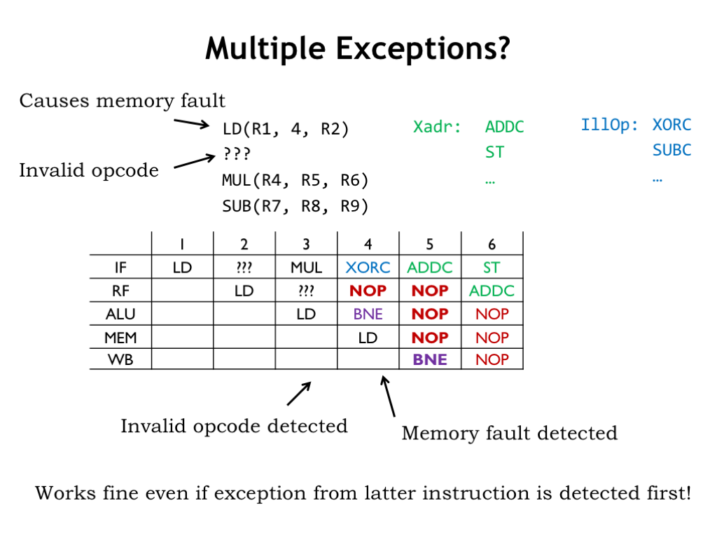 Since the pipeline is executing multiple instructions at the same time, we have to worry about what happens if multiple exceptions are detected during execution. In this example assume that LD will cause a memory exception in the MEM stage and note that it is followed by an instruction with an illegal opcode.