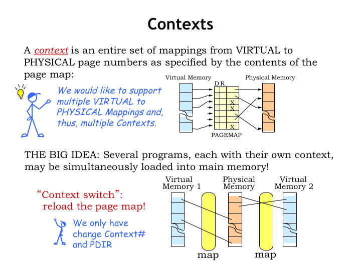The page map creates the context needed to translate virtual addresses to physical addresses. In a computer system that’s working on multiple tasks at the same time, we would like to support multiple contexts and be able to quickly switch from one context to another.