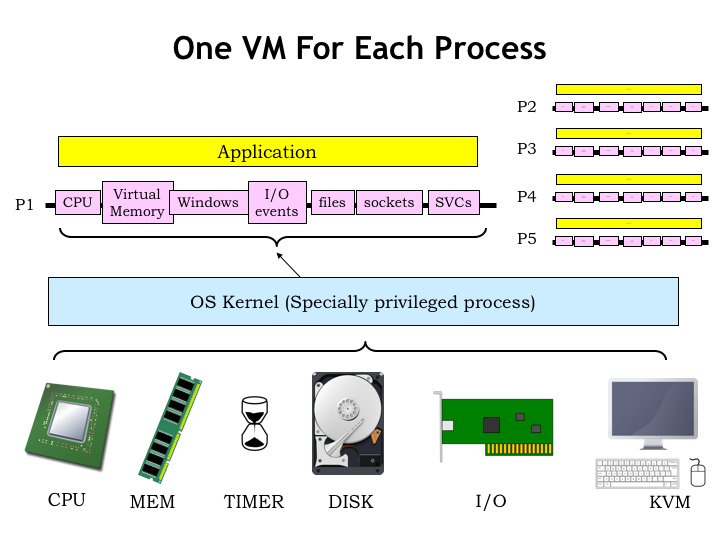 The OS provides an independent virtual machine for each process, periodically switching from running one process to running the next process.