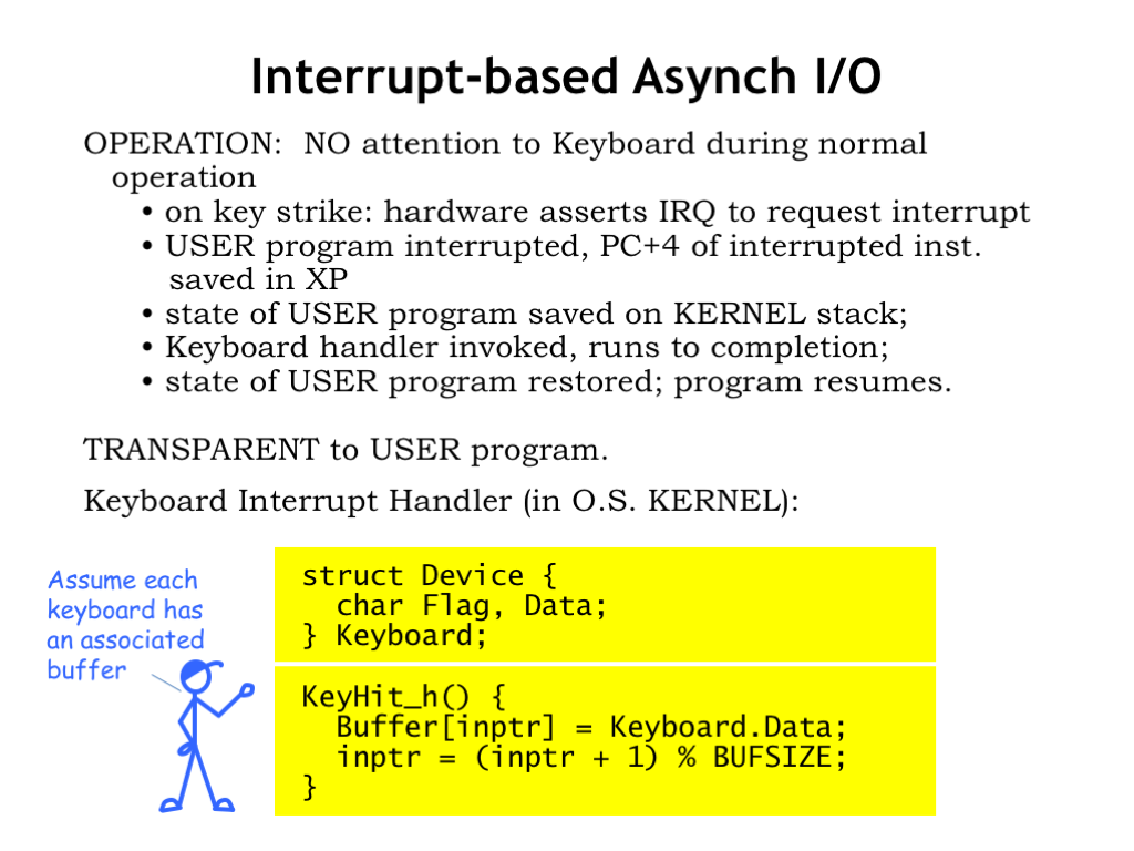 Note that the user-mode program didn’t have any direct interaction with the keyboard, i.e., it’s not constantly polling the device to see if there’s a keystroke to be processed. Instead, we’re using an “event-driven” approach, where the device signals the OS, via an interrupt, when it needs attention.