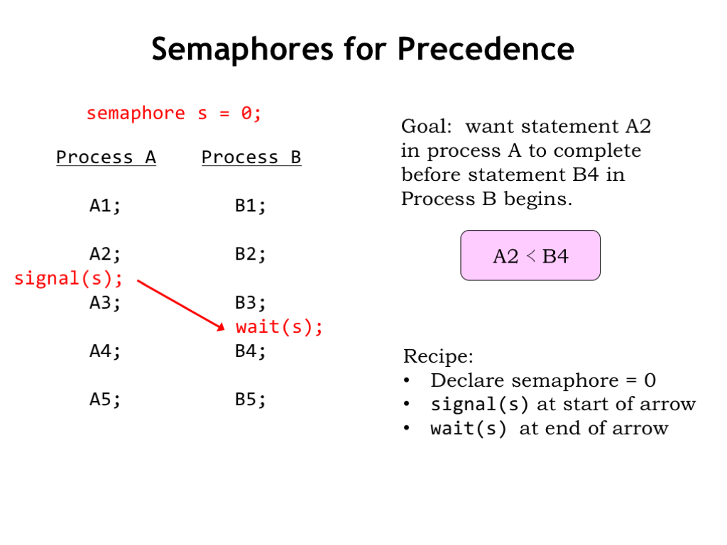 With these modifications, process A executes as before, with the signal to semaphore s happening after statement A2 is executed.