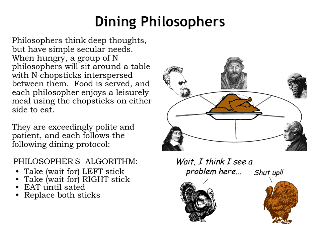 The problem of deadlock is elegantly illustrated by the Dining Philosophers problem. Here there are, say, 5 philosophers waiting to eat. Each requires two chopsticks in order to proceed, and there are 5 chopsticks on the table.
