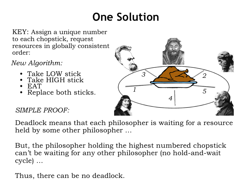 How does this avoid deadlock? Deadlock happens when all the chopsticks have been picked up but no philosopher can eat. If all the chopsticks have been picked up, that means some philosopher has picked up the highest-numbered chopstick and so must have earlier picked up the lower-numbered chopstick on his other side. So that philosopher can eat then return both chopsticks to the table, breaking the hold-and-wait cycle.