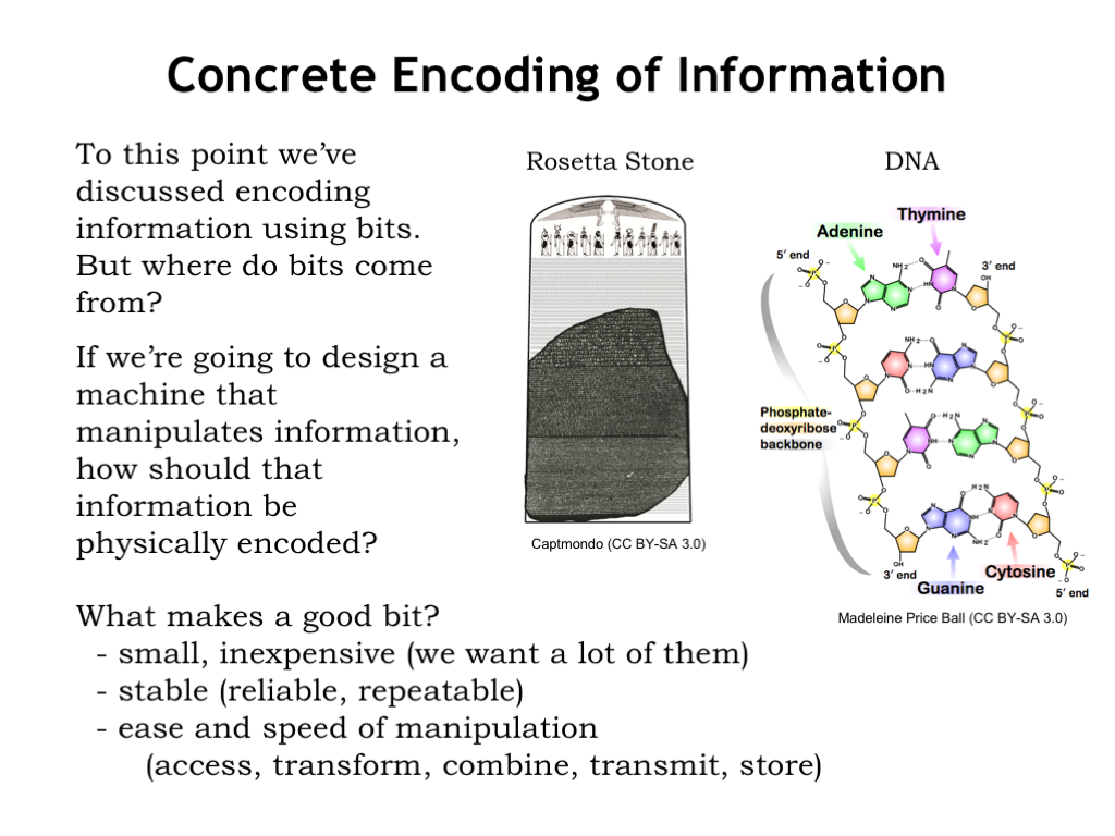 Assuming we don’t want to carry around buckets of gooey DNA or stone chisels, how should we represent bits?