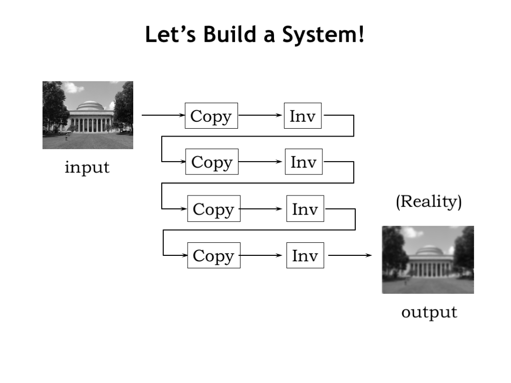 We’ll create a system using two simple processing blocks. The COPY block reproduces on its output whatever voltage appears on its input. The output of a COPY block looks the same as the original image. The INVERTING block produces a voltage of 1-V when the input voltage is V, i.e., white is converted to black and vice-versa. We get the negative of the input image after passing it through an INVERTING block.