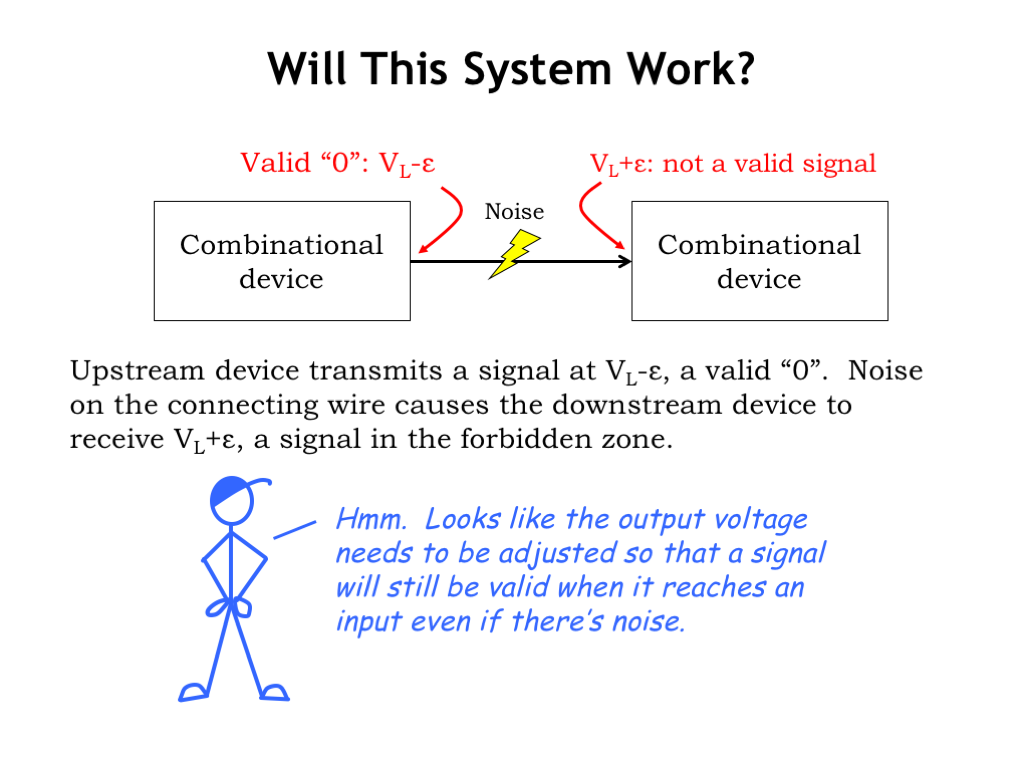 Now suppose some electrical noise slightly changes the voltage on the wire so that the voltage detected on the input of the downstream device is slightly above \(V_{\textrm{L}}\), i.e., the received signal no longer qualifies as a valid digital input and the combinational behavior of the downstream device is no longer guaranteed.