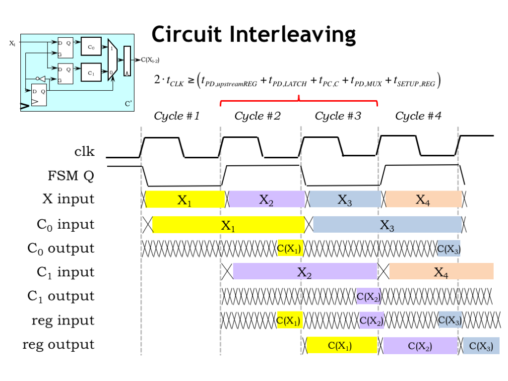 What about the clock period for the interleaving system? Well, there is some time lost to the propagation delays of the upstream pipeline register that supplies the X input, the internal latches and multiplexer, and the setup time of the output register. So the clock cycle has to be just a little bit longer than half the propagation delay of the C module.