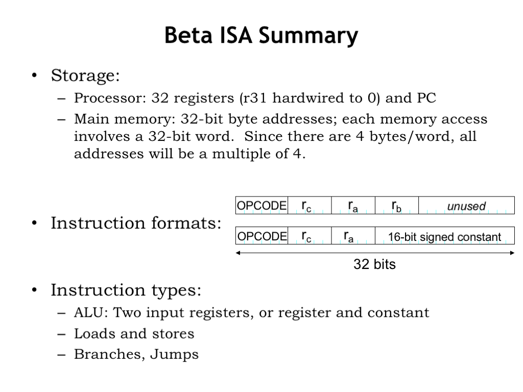 Having talked about the storage resources provided by the Beta ISA, let’s design the Beta instructions themselves. This might be a good time to print a copy of the handout called the “Summary of Beta Instruction Formats” so you’ll have it for handy reference.