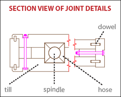 The tower frame that holds the screw and nut uses joints that are aligned with wooden dowels and held together with steel hex head bolts. These are strong and easy to take apart and reassemble when necessary. They are also relatively easy to make. The drawings show to scale the press as it was built in the shop. Working the press produces large forces that require a strong frame, but the particular dimensions of the Beaver Press parts were the result of making the best use of the wood we had. Anyone wanting to make their own press should do the same, keeping basic structural needs in mind.