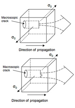 where c is the crack size and f is a factor close to unity. Using the crack size and stress values given, we get a value KI = 0.069 MPa m1/2. This value is out of the range of the data plots on the figure above, but by extrapolation we can estimate the crack propagation velocity to be 5 nm/s. It would thus take 30 s for the crack to grow another 150 nm.