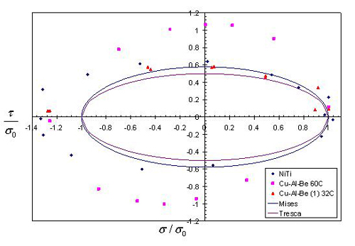 The change in yield surface between the two different temperatures for Cu-Al-Be could be explained if 60°C is above the Af temperature for Cu-Al-Be while 32°C is below the Mf temperature for Cu-Al-Be and the testing temperature for the NiTi was below that materials Mf. The changes between the two different temperatures of Cu-Al-Be would therefore represent two different phases of the material. This would indicate that the proposed yield surface would be appropriate for materials in their martensitic state but not for materials in their austenitic state. The agreement between the NiTi data and the Cu-Al-Be data taken at 32°C would indicate that the yield surface, when scaled properly, would characterize both the NiTi and Cu-Al-Be quite well.
