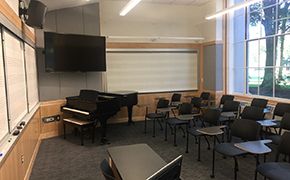 • Photograph of classroom with a piano on the far wall, white boards on the far and left wall. Tablet chairs along the right wall of windows.