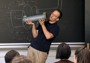 Dr. Short holding up a fouled heat exchanger in Lecture 2. (Image courtesy of MIT OpenCourseWare.)