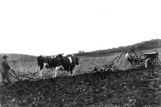 The old and the new: a tractor and plow, in front of a pair of oxen pulling a plow. (Image courtesy of the Library of Congress, Prints & Photographs Division, LC-USZ62-55902.)