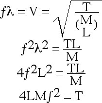 The final step of this derivation is an equation of T in terms of a number of variables that we can measure fairly easily. Here is a chart of the values of those variables for the four strings, and for the corresponding value of T when the given values are plugged into the derived equation: