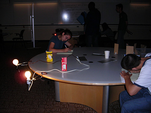 Physical resources: Bright and dim light bulbs, 2 mini-maglights, red ball, red lightbulb, cardboard light blockers, screen/blank wall, radiometer (2?), 2 beakers of water, thermometer, tub of water (with milk), laser pointers, mirrors, solar cell, graph paper "detectors".