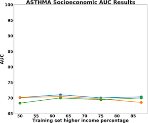 To train the model, training data subsets were randomly sampled from the superset that intentionally introduced imbalances along protected variables. For example, with regards to income, training data subsets ranged from 50% high-income to 50% low-income and 87.5% high-income to 12.5% low-income. To account for stochastic error, this process was run 1000 times for each test. The area under the curve of the receiver operating characteristic curve was used as the metric for accuracy.